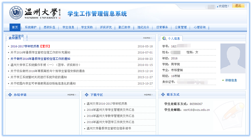 学工系统是贯穿大学生活的一个很重要的信息媒介。可在系统中的下载专区下载学校相关的各类文件,可在系统中办理个人信息维护、学生干部职务申请、评奖评优申请、各类资助申请、勤工助学岗位申请、勤工助学工资发放、日常事务(假期管理、假期留校申请、场地申请)等。请新老生同学们尽快将学工系统中的个人信息进行维护,并在以后的大学生活中将信息不断更新,以便不影响在校期间接受各类紧急信息及各项事务办理。个人信息维护示意图如下: