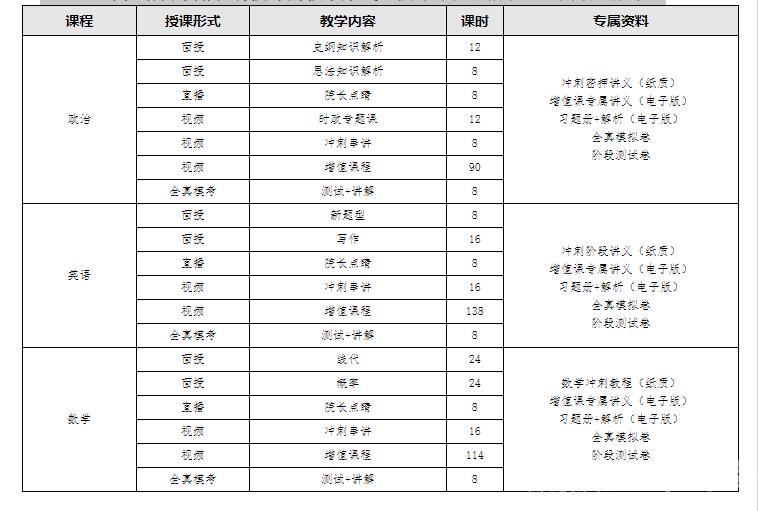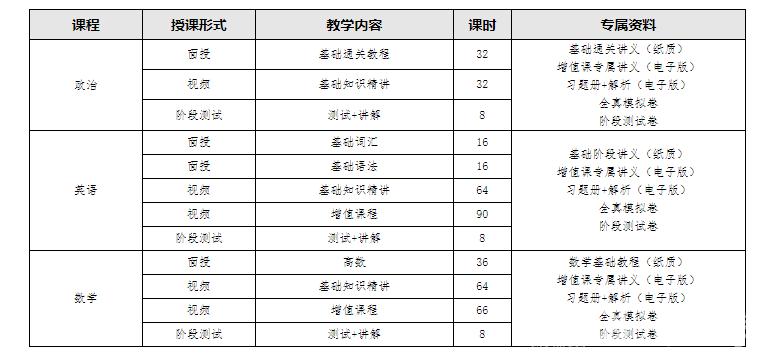 课程培训采用现场授课的教学形式,授课课程包括政治、英语、数学。
