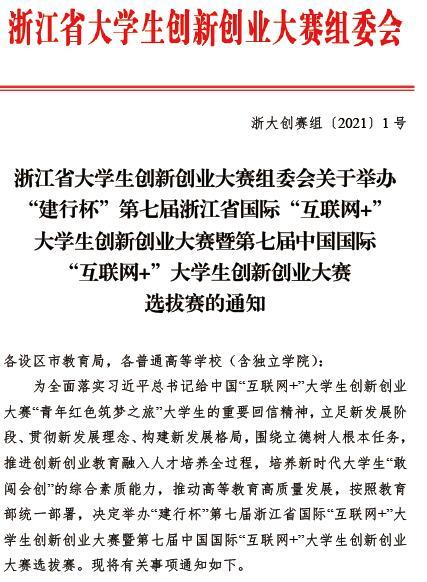 浙江省大学生创新创业大赛组委会关于举办“建行杯”第七届浙江省国际“互联网 ”大学生创新创业大赛暨第七届中国国际“互联网+”大学生创新创业大赛选拔赛的通知