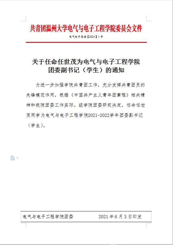 关于任命任世茂为beat365在线唯一官网团委副书记(学生)的通知