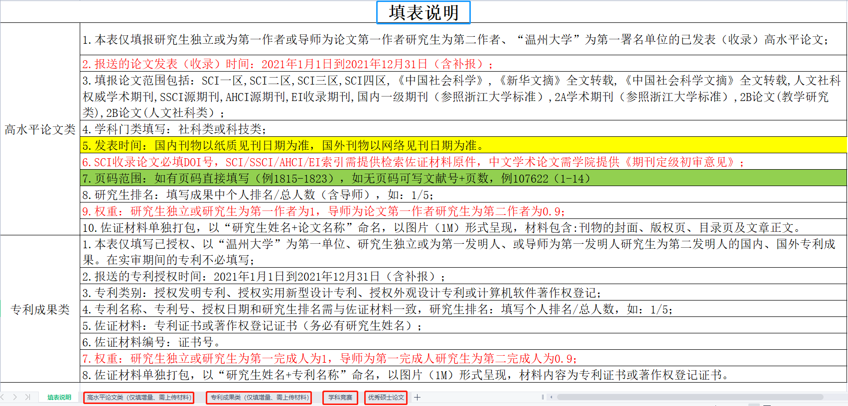 2.汇总表成果均需提供相应的证明材料,以原件为准:SCI/SSCI/AHCI/EI索引以检索证明材料为参考;中文学术论文以学院《期刊定级初审意见》(附件3)为参考;专利证书复印件需经办人签字和学院盖章。