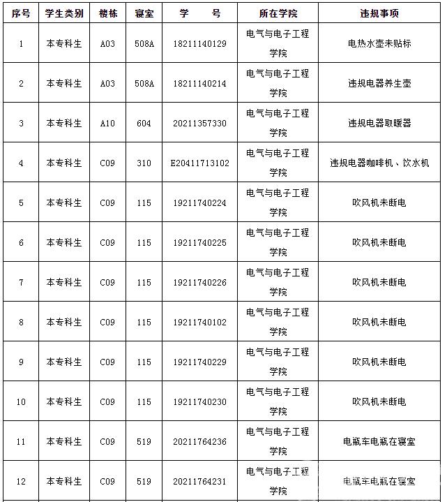 根据学校学生公寓安全“四级联查”工作机制要求,学工部、研工部、后勤管理处、保卫处联合于2月23日对学生公寓区安全情况进行检查,在检查中beat365官网共存在12起安全违规现象,现予以通报批评,请大家引以为鉴。