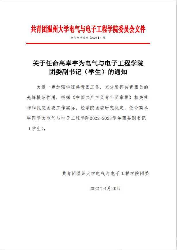 关于任命高卓宇为beat365在线唯一官网团委副书记(学生)的通知
