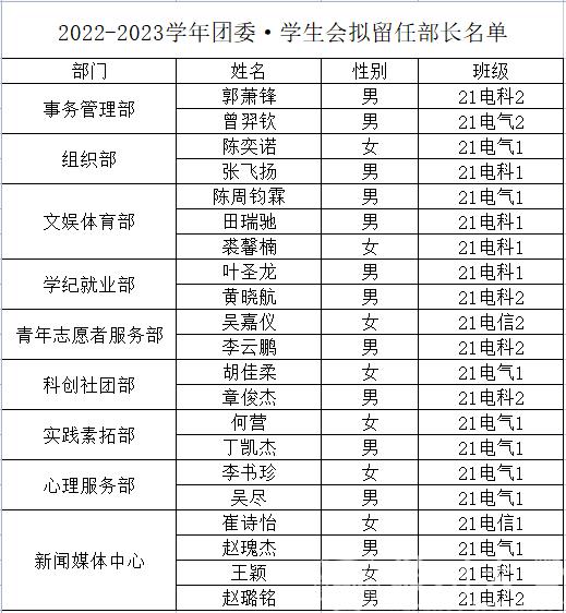 根据团委学生会干事自愿报名以及学院综合考虑,决定拟聘任以下同学为beat365官网2022-2023学年团委学生会部长: