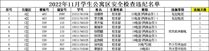 今年11月9日是第31个全国消防日,根据学校学生公寓四级联查机制工作要求,学工部、研工部、后勤管理处、保卫处联合,于11月9日(上周)对全校学生公寓区安全情况进行检查。beat365官网有9位同学存在违规情况(名单见下),按要求给予院内通报批评。请相关寝室/同学尽快整改落;请其他同学引以为戒。