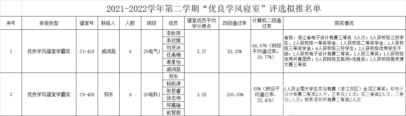 为进一步加强院风学风建设,发挥优秀寝室树立的导向和典型作用,引导和激励广大学生刻苦学习、立志成才,根据《beat365在线唯一官网优良学风寝室评选办法》规定,经各寝室申请,学院初评,拟推荐 C1-418等2个寝室获得2021-2022学年第二学期“优良学风寝室”称号。现将名单给予公示