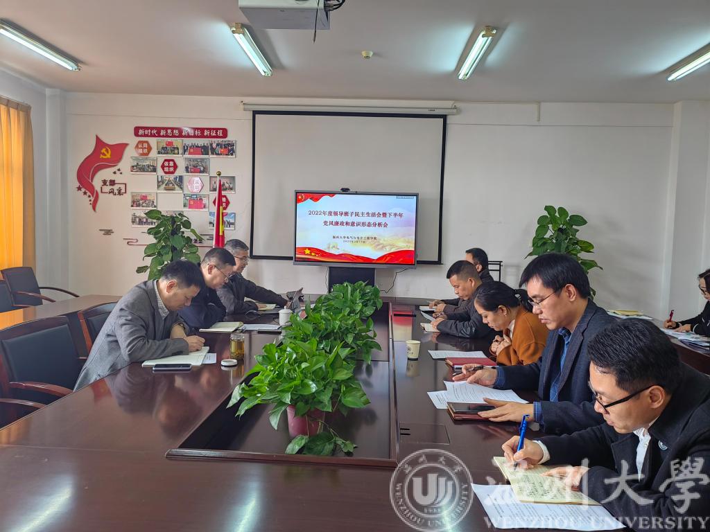 会议通报了党史学习教育专题民主生活会整改措施落实情况、上年度民主生活会征求到的师生意见建议落实情况,以及本次民主生活会征求意见建议情况。党委书记李方强代表学院领导班子成员做2022年班子工作对照检查和下半年意识形态工作分析报告,重点从六方面查摆存在问题和不足,深刻剖析问题原因,明确努力方向和整改措施。党委副书记兼纪委书记曾蓓蕾做学院2022年下半年党风廉政建设分析报告,总结分析了学院去年下半年以来全面从严治党和党风廉政建设情况。随后,党员班子成员逐一进行了个人对照检查,结合自身工作进行放风廉政分析和意识形态分析。非党员班子成员结合自身工作进行放风廉政分析和意识形态分析。大家开门见山、紧扣主题,对照6项检查内容,结合党风廉政和意识形态专题进行汇报交流,对自身存在的问题作了深刻的剖析检查,并提出了具体的改进措施,相互之间认真开展了严肃的批评和自我批评。所有班子成员在会上都汇报2022年个人有关重大事项变化情况。